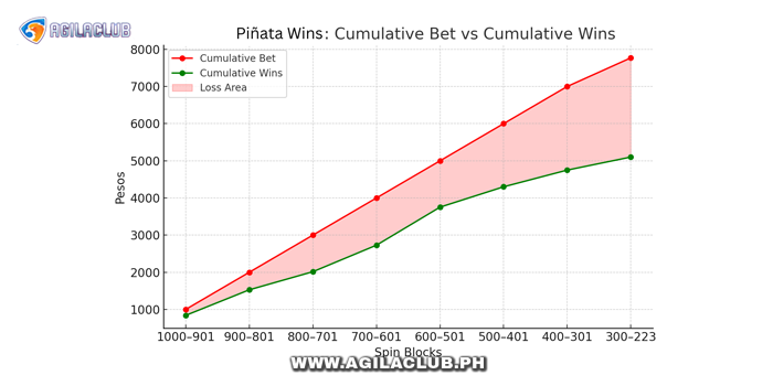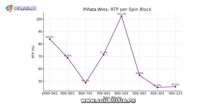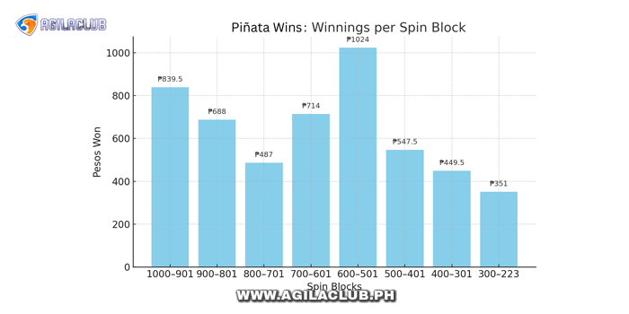 The block covering spins 501 to 600 delivered over ₱1,000 in returns, making it the lone stretch that finished ahead of what was wagered. Outside of that window, most blocks struggled to keep pace, with several producing less than half of the bet amount.